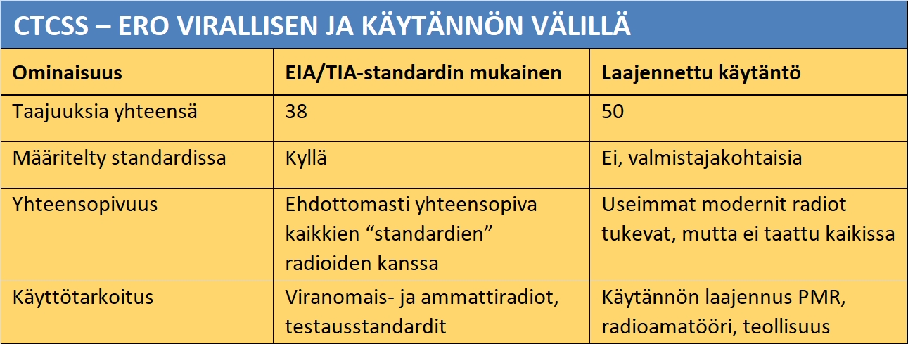 Taulukko 1. Erot virallisen CTCSS-standardin ja laajennetun käytännön välillä.