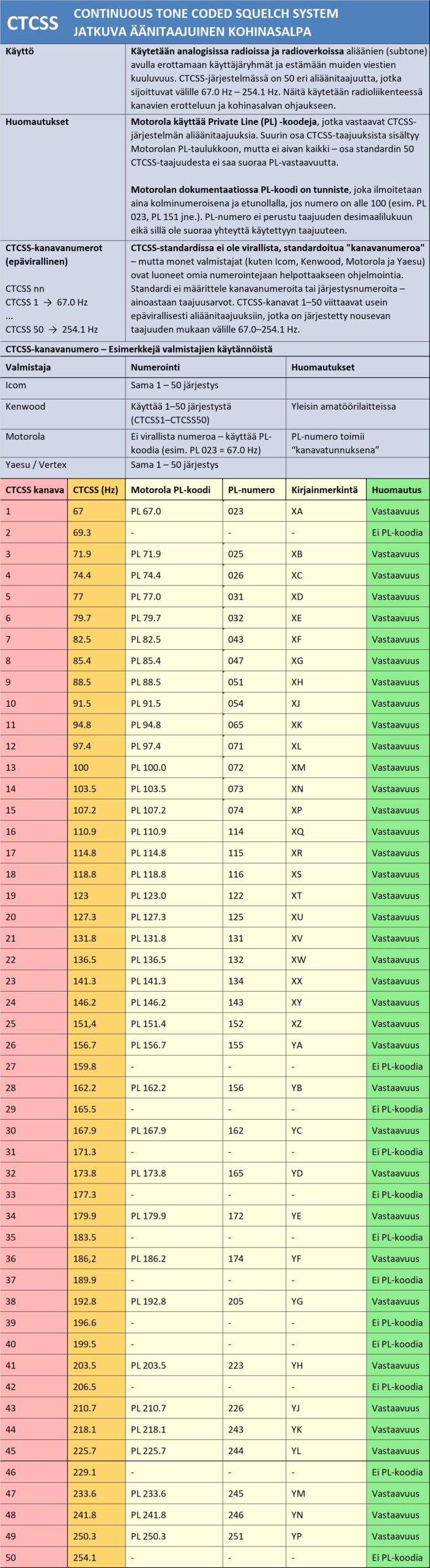 Laajennettu CTCSS – käytännön 50-taajuuden taulukko