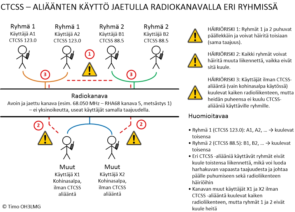 CTCSS ei suojaa radioliikennettä taajuuden päällekkäiskäytöltä, vaan ainoastaan suodattaa vastaanotettua lähetettä. Jaetussa puheradioliikenteessä, jossa lähetys (TX) ja vastaanotto (RX) tapahtuvat samalla taajuudella vuorotellen, tämä voi johtaa liikenteen häiriöihin, päällekkäislähetyksiin ja turvallisuusongelmiin. Siksi CTCSS-aliäänien käyttöä tulisi välttää avoimella tai jaetulla kanavalla, ellei liikenteen koordinointi ja taajuuden yksinoikeus ole varmistettu — etenkin suurissa yleisötapahtumissa.