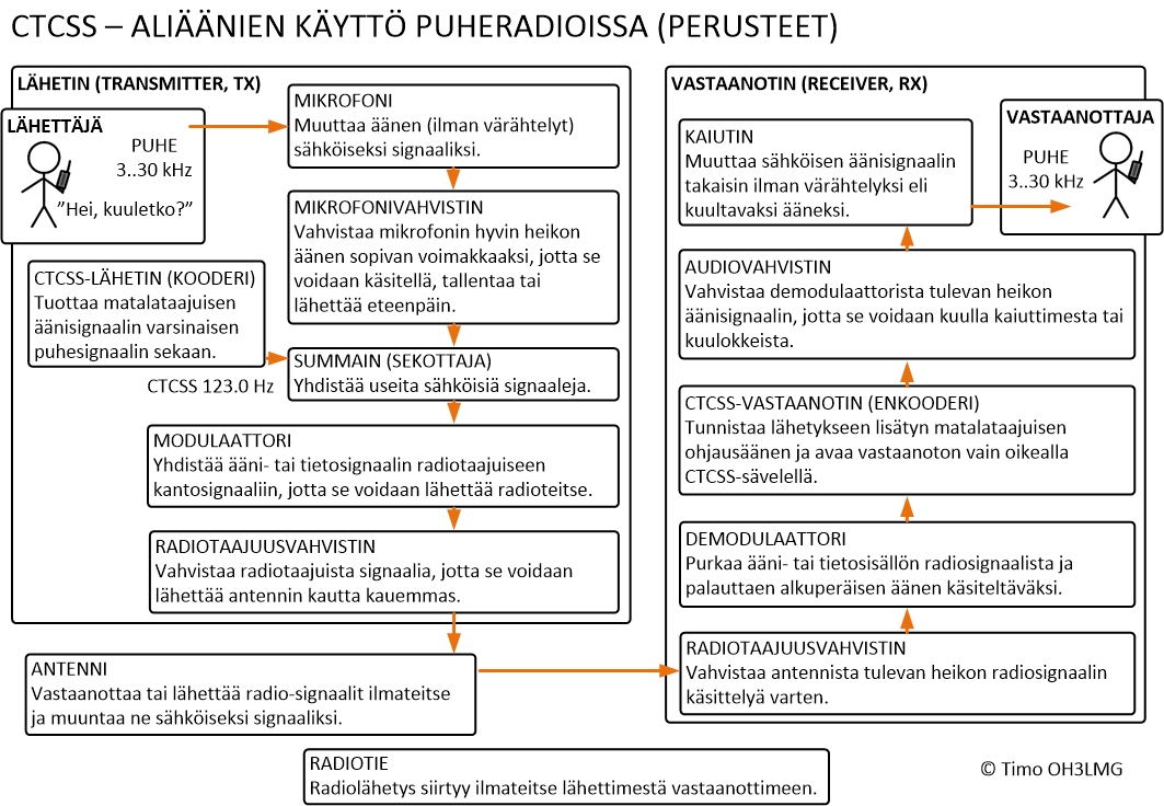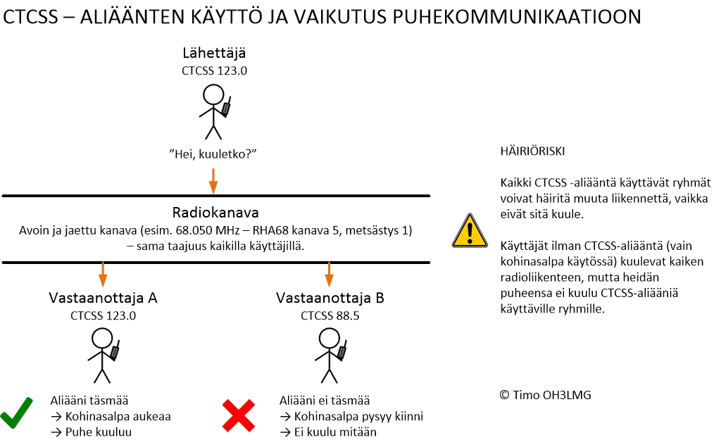 Kuvassa 1 on yksinkertaistettu esitys siitä, miten puhe ja CTCSS-aliäänet kulkevat lähettäjältä vastaanottajalle. Kuvassa 2 sama asia on havainnollistettu käytännön puheradioviestinnässä.
